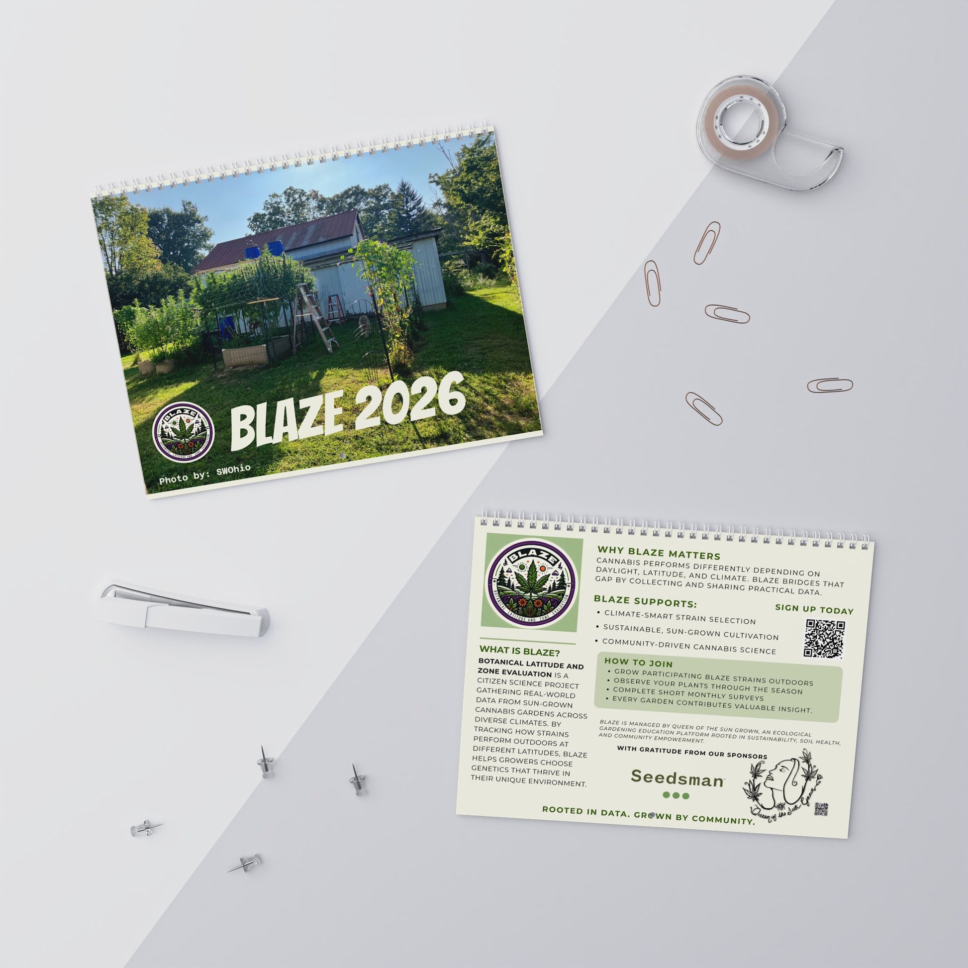 Bring a year of seasonal curiosity and hands-on learning to your wall with this botanical, citizen-science calendar. Each month is anchored by vivid photos contributed by Blaze participants, paired with latitude- and growing-zone-aware tips that help you track what matters where you live. Mark the moments that count — planting windows, observation notes, and harvest timeline. It hangs easily with a centered hole and wire coil, and the matte month panels welcome pens and markers so your observations stay clear. This is for gardeners, community scientists, and anyone who wants a living record of the year’s green rhythms.